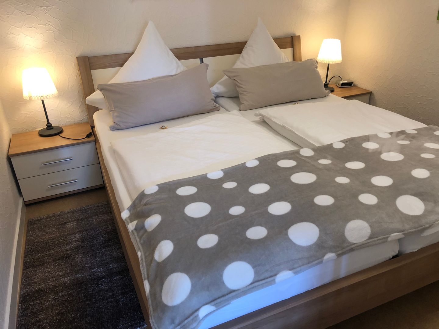 zwei Schlafräume (Ehebett/ Etagenbett), gemütlicher Wohnraum mit Essecke und Sat-TV, sep. Einbauküche und Dusche/WC
